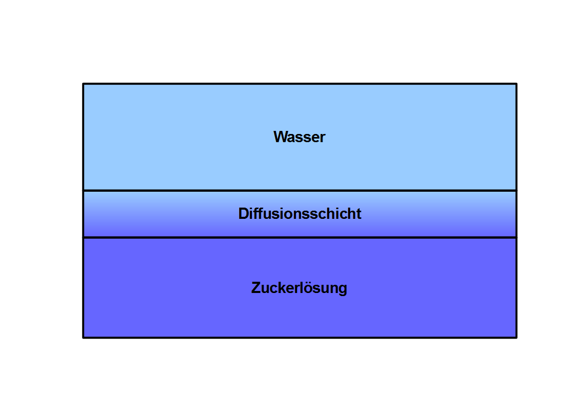 Skizze zur Diffusion einer Wasserschicht und einer Schicht Zuckerlösung.