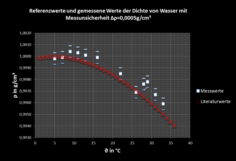 Westphalsche Waage: Plot zum Vergleich der aufgenommenen Messwerte mit Literaturwerten. Geplottet sind die gemessenen Dichtewerte für Wasser in Abhängigkeit der gemessenen Temperaturwerte (weiße Quadrate). Die schmalen Balken zeigen das Intervall der Messwerte für die Dichte unter Berücksichtigung der Messunsicherheit. Die Messunsicherheit für die Temperatur ist in der Breite der Quadrate und Balken berücksichtigt. In rot sind die Literaturwerte geplottet.