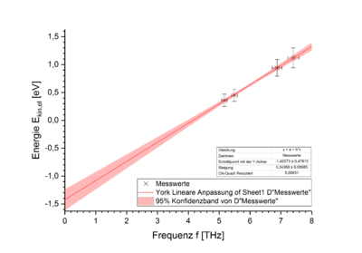 Diese Gegenspannungen entsprechen der maximalen kinetischen Energie der durch den Photoeffekt ausgelösten Elektronen (angegeben in Elektronenvolt: eV). Werden diese Energien über der nach berechneten Frequenz der eingestrahlten Photonen aufgetragen, ergibt sich ein einer Gerade sehr nahe liegender Verlauf, wie in Abb. 7 ersichtlich. Für diese vier Werte wurde ein linearer Fit unter Berücksichtigung der x-Fehler durchgeführt. Der so ermittelte Anstieg der Geraden entspricht dem Plank'schen Wirkungsquantum . Hierbei ergab sich ein Wert von . Der Literaturwert liegt dabei noch innerhalb des einfachen Fehlerintervalls.