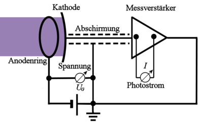 Wird die Photozelle wie beschrieben mit dem Licht einer bestimmten Wellenlänge bestrahlt, führt der Phototeffekt zu einer Übertragung von Energie auf freie Elektronen im Kathodenmaterial. Diese werden ausgelöst und können dann aufgrund der verbliebenen kinetischen Energie den Raum innerhalb der Photozelle durchqueren und zur Anode gelangen. Der so entstehende Photostrom liegt in der Größenordnung von Nano- bis Pikoampere (wobei ein Pikoampere immer noch beachtlichen 6 Millionen Elektronen pro Sekunde entspricht, wie eine kurze Abschätzung zeigt). Um diesen Strom zu messen, wird also ein Messverstärker benötigt. Zeigt das an den Messverstärker angeschlossene Multimeter dabei auch bei hohen Verstärkung keinen Ausschlag, kann das verschiedene Gründe haben. Zunächst sollte zu Beginn ein Interferenzfilter mit möglichst niedriger Wellenlänge gewählt werden, da dort im Allgemeinen ein höherer Photostrom erreicht werden kann. Auch kann es sein, dass die Photozelle falsch herum angeschlossen wurde (und der sich ergebende Strom negativ ist). Das kann über einen Umpolungsschalter am Multimeter überprüft werden. Anschließend sollten nacheinander die verwendete Photozelle, das Multimeter und so möglich auch der Messverstärker getauscht werden, um Fehlfunktionen der Geräte auszuschließen. Wenn ein Photostrom angezeigt wird, kann mit der Aufnahme der Kennlinien begonnen werden.