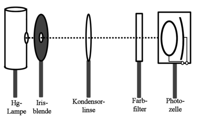 Zu Beginn der Messungen sollte als erstes die Quecksilber-Hochdrucklampe in Betrieb genommen werden, da diese eine Aufwärmzeit (etwa 10 Minuten) benötigt. Wurde der Aufbau wie oben beschrieben vorgenommen, sollte das Licht durch die Linse auf die Rückseite der Photozelle fokussiert werden. Wie das überprüft und ggf. nachjustiert werden kann, wird in der Anleitung von Leybold beschrieben und kann dort nachgelesen werden.