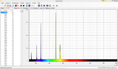 Die verwendete Spektrallampe hat dabei ein deutlich ausgeprägtes Linienspektrum, wie durch eine Messung mit SpectraLab (siehe Abb. 3) bestätigt werden konnte. Das Spektrum konnte durch die Interferenzfilter auf einzelne Linien eingeschränkt werden, die hier alle dem sichtbaren Bereich von etwa 400 bis 600 nm entnommen wurden. Mit Hilfe der Linse wurde das Licht der Spektrallampe auf die Kathode der Photozelle fokussiert. Die Filter wurden dabei direkt vor das Gehäuse der Photozelle gestellt. So konnte der Einfluss von Streulicht wirkungsvoll unterbunden werden. Nichtsdestotrotz wurden alle Versuche in einem abgedunkelten Raum durchgeführt.