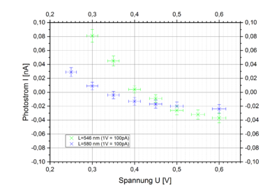 In Abb. 4 sind die Verläufe aller vier Kennlinien im Groben dargestellt. Abb. 5 erlaubt einen Vergleich der Werte für beide Verstärkungen bei und . Dabei ergibt sich als genereller Verlauf (s. z.B. die schwarzen Punkte in Abb. 4) eine Abnahme der Stromstärke mit steigender Spannung, wobei am Rand zum Teil ein Abflachen beobachtet werden kann. Wurde die Spannung über 1,5 V erhöht, blieben die gemessenen Stromstärken bis mindestens 5 V konstant (nicht in der Abb. dargestellt). Es fällt auf, dass für und deutlich geringere Stromstärken beobachtet wurden, wenngleich auch hier ein Abfall der Werte auftrat. Abb. 6 zeigt die Nulldurchgänge für diese beiden Wellenlängen in einer ähnlichen Auflösung wie Abb 5. Im Vergleich der vier Kennlinien ist festzustellen, dass der Nulldurchgang für größere Wellenlängen bei kleineren Gegenspannungen erreicht wurde.