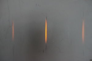 Für die Demonstration wurden an unabhängigen Tagen verschiedene Messungen zum Abstand der Absorptions- und Emissionslinien von Natrium bei gleichbleibender Distanz Gitter-Schirm (da = (18,30 ± 0,06) cm, bzw. de = (20,20 ± 0,06) cm) durchgeführt, wobei innerhalb der Messungenauigkeit immer die gleichen Werte ermittelt wurden. Die Unsicherheit ergibt sich dabei aus der Produktionsunsicherheit des Lineals (100 µm + 10-3·L, vgl. Einführungsskript Grundpraktikum[4] (2007), S. 17) und der Ablesegenauigkeit (0,5 mm). Für eine ordentliche Verifizierung des Wertes müsste man den Versuch vor einer Messung immer ab- und wieder neuaufbauen.