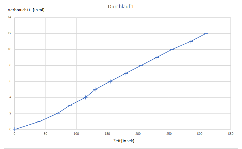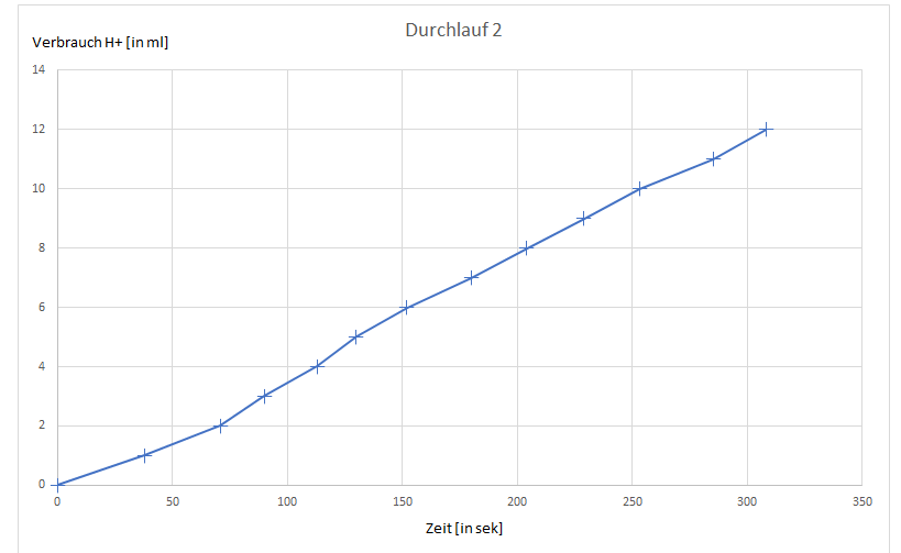 Tabelle 1. Wasserstoffvolumen und Laufzeit des Autos| Verbrauch von H+ [in ml] | Durchlauf 1 [in sek] | Durchlauf 2 [in sek] |