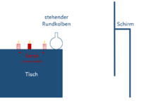 Der stehende Rundkolben (im weiteren Verlauf nur Kolben genannt) wird an der Kante eines Tisches positioniert. Auf dem Tisch steht die Kerze wie in Abb. 3 in ca. 40 cm Entfernung zum Kolben. Auf der anderen Seite (vor dem Tisch) wird der Schirm so positioniert, dass er für die Schüler gut sichtbar ist. Der Abstand zum Kolben wurde mit 1,30 m gewählt, da der Schirm so auf jeden Fall außerhalb der doppelten Brennweite steht. Auf Abb. 3 ist der schematische Aufbau dargestellt, auf Abb. 4 sieht man den Aufbau in einem abgedunkelten Raum.