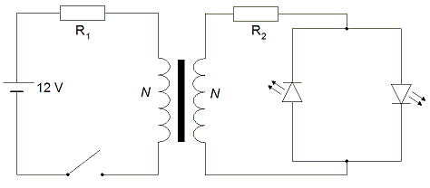 Der Sekundärstromkreis besteht aus einer Spule, deren Windungszahl jener der Spule aus dem Primärkreis entspricht, und zwei zueinander antiparallel, aber in Reihe zur Spule geschalteten Leuchtdioden (Abb. 1). Auch hier gilt wieder, dass bei geringer Windungszahl der Spule ein Widerstand in Reihe zur Spule zu schalten ist, um die Dioden nicht zu beschädigen. Die beiden Spulen können durch einen geschlossenen Eisenring miteinander verbunden werden (dies ist allerdings nicht unbedingt notwendig).