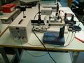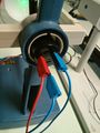 Die Elektronenbeugungsröhre wird vorsichtig in den Röhrenständer geführt. Die Kathodenheizung (Anschluss F1, F2 am Röhrenständer) muss nun mit dem Hochspannungs-netzgerät rückseitig (Wechselspannung, 6,3 V / 2 A) verbunden werden. Zusätzlich wird Buchse C und X an den Minuspol und Buchse A (Anode) an den Pluspol des 5kV / 2 mA Ausganges angeschlossen.