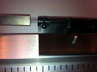 - Der Gleiter wird per Hand in Bewegung versetzt, sodass er mit der Feder voran auf den Stopper zugleitet. Es ist darauf zu achten, dass der Stoß nicht zu stark wird. Die Feder sollte in der Lage sein, den Stoß abzufedern. Sie sollte also nicht maximal gestaucht werden.