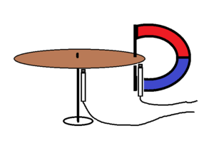 Historischer Aufbau: Es hängt eine Magnetnadel an einem Faden dicht über einer Metallscheibe, wobei Kupfer besser ist als Eisen, die rotierbar ist. [8]
