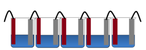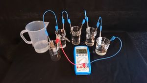 Durch die Reihenschaltung der einzelnen Bechergläser, welche mit Experimentierkabel leitend verbunden sind, addieren sich die Spannungen der einzelnen Plattenpaare auf. Jedoch kommt es erst zu einem elektrischen Stromfluss, wenn ein Lastwiderstand angeschlossen wird.