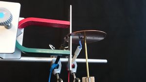 Zwei lange (1) Stativstangen werden in die (2) Stativfüße gespannt und je eine (3) Halterzwinge über den (2) Füßen befestigt. Eine weitere lange (1) Stativstange wird waagerecht in die (3) Halterzwingen für einen festen Abstand gespannt. Über diesen ersten (3) Halterzwingen werden wieder je (3) Eine mit jeweils einer kurzen (1) Stativstange befestigt. An die Enden der kurzen (1) Stangen werden mit (3) Halterzwingen die (5) Kurbel und die (6) Drehlager befestigt, welche mit dem (7) Übersetzerriemen verbunden sind, der auf Spannung gebracht wird. Zudem ist für einen stabileren Aufbau eine weitere (1) Stativstange, welche mit den (4) Winkelhalterzwingen an den kurzen (1) Stangen befestigt wird, notwendig. In der (6) Drehlager sollte nun die (11) Spitze eingespannt werden (sollte die Feststellschraube aus Eisen bestehen kann man die (11) Spitze auch mit Pappe sicher befestigen) und zwar so, dass sie senkrecht steht sowie eine Drehbewegung ausführen kann und nicht in einem Kreis rotiert. Auf der (11) Spitze befestigt man die (13) Kupferscheibe, welche waagerecht austariert sein sollte. Zuletzt bringt man den (8) Stabmagneten mit dem (10) Klebeband so an die (9) Angelsehne an, dass er waagerecht über der Mitte der (13) Kupferscheibe (Spitze der (11) Spitze) hängt, indem das Ende (9) Angelsehne an eine weitere (1) Stativstange geklebt wird, welche wieder mit einer (3) Halterzwinge am oberen Ende der langen waagerechten (1) Stativstange befestigt wird, an der sich auch die (6) Drehlager befindet.