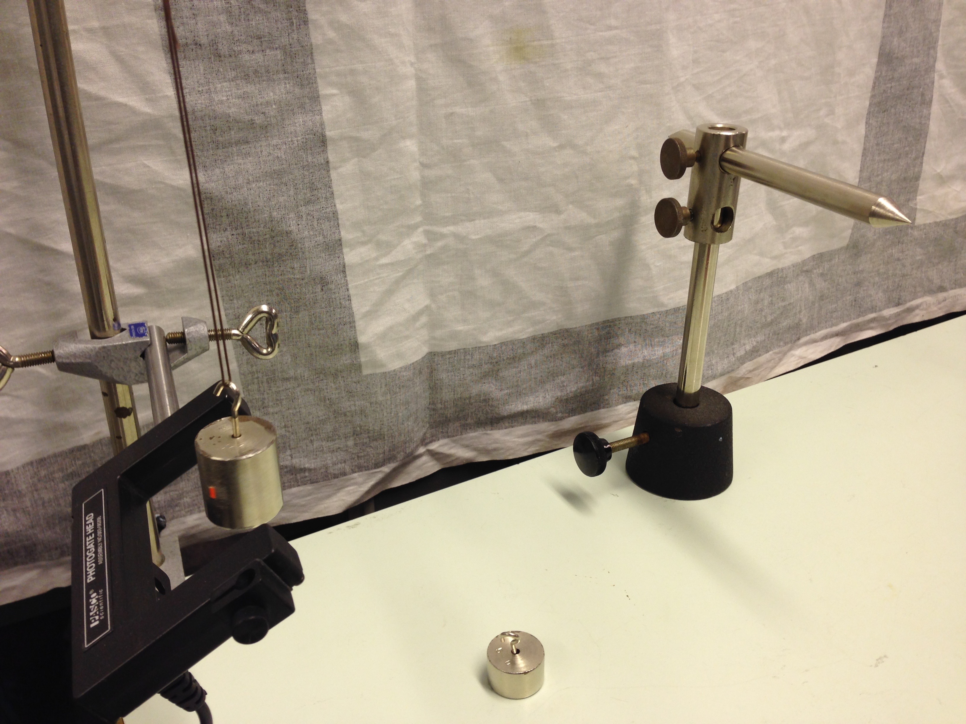 Im Folgenden wird jedes Massestück mehrmals ausgelenkt (Abb. 1) bzw. gehoben (Abb. 2), bis dessen Schwerpunkt auf der Höhe der Höhen-Hilfe ist. Dann wird die Masse losgelassen und mittels der Lichtschranke die Durchschwing- bzw. Durchfallzeit gemessen.