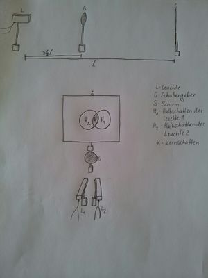 Der Versuchsaufbau zur Erzeugung von farbigen Schatten ist in Abbildung 1 abgebildet. Durchgeführt wird der Versuch mit 2 Leuchten, fakultativ auch mit drei Leuchten. Zusätzlich wird ein opaker Gegenstand benötigt, der als Schattengeber dienen soll.