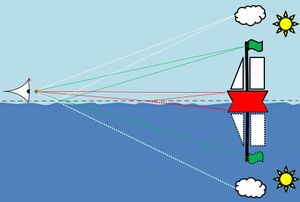 Betrachten wir zum Beispiel erneut ein Schiff auf dem Meer an einem sonnigen Tag. Die Luft direkt über dem kalten Wasser erwärmt sich weniger stark als höhere Schichten (Abb. 1). Das von Boot und Umgebung gestreute Licht kann an der Grenze zwischen warmer und kalter Luftschicht reflektiert werden (Abb. 2). Die parallel zur Meeresoberfläche liegende Grenzschicht der beiden Luftschichten wirkt also als Spiegel und ein Beobachter über der Grenzschicht kann in ihm ein kopfstehendes Spiegelbild des Bootes erblicken (Schema in Abb. 3 und bereits erwähntes Photo einer Yacht). Insbesondere wird auch der Himmel, den der Beobachter über und hinter dem Schiff sieht, an der Schichtgrenze gespiegelt. Von der Yacht ist genau der Teil sichtbar, der sich überhalb der Schichtgrenze befindet; dieser Teil wird überdies nach unten gespiegelt. Die Grenze zwischen tatsächlichem und gespiegeltem Himmel ist für uns als Beobachter aufgrund des geringen Kontrastunterschieds z.T. nicht erkennbar. Da die Reflektivität der Luftschichtgrenze jedoch nicht allzu hoch ist, wird der Himmel nur für flache Eintrittswinkel des Lichts effektiv reflektiert, weshalb näher am Betrachter das Meer trotz der Luftschichtgrenze "durchscheint". Das führt den Beobachter zur Annahme eines scheinbaren Horizonts an einer tieferen Position als der des tatsächlichen Horizonts. Das Schiff, dessen Rumpf naturgemäß unterhalb des wirklichen Horizonts das Wasser berührt, befindet sich über diesem scheinbaren Horizont und scheint deshalb zu schweben.