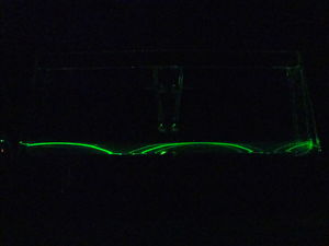 Um den Weg des Lichtes direkt sichtbar zu machen, wenn es auf die Grenzfläche zwischen Süß- und Salzwasser trifft, verwenden wir einen Laser, den wir von unten in flachem Winkel gegen die Grenzfläche richten.