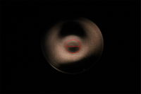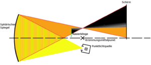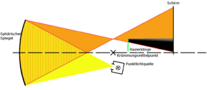 | Bild auf dem Schirm mit der Klinge im Krümmungsmittelpunkt | Der gesamte Spiegel erscheint als schwach ausgeleuchtete Kreisscheibe, wobei sich deutlich hellere und dunklere Zonen voneinander abgrenzen. |
