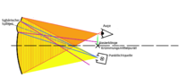 | So sind dominante Ungenauigkeit dabei Erhebung oder Eindellung in der Spiegeloberfläche, die in besonderer Form bei der Herstellung des Spiegels auftreten. Ein Spiegel wird kreisförmig geschliffen. Hierbei kann es passieren, dass Kreisringe um den Mittelpunkt zu schwach bzw. zu stark geschliffen sind. Dies führt zu Eindellungen bzw. Erhebungen rotationssymmetrisch um den Mittelpunkt. Trifft das Licht auf diese Erhebung bzw. Senkung, so kann diese Stelle als eigenständiger Spiegel mit eigenem Krümmungmittelpunkt angenähert werden, welcher sowohl von der Entfernung als auch von der Richtung von dem Krümmungsmittelpunkt des Gesamtspiegels abweichen kann (siehe Abbildung 17). Die daraus resultierende Lichterscheinung ist auf der oberen Hälfte hell und auf der unteren Hälfte dunkel, wenn der Spiegel zu schwach geschliffen ist und genau andersherum, wenn er zu stark geschliffen ist, da sich der Krümmungsmittelpunkt dieses Segments auf der optischen Achse hinter bzw. vor dem eigentlichen Krümmungsmittelpunkt befindet (siehe Abbildung 18). | |
