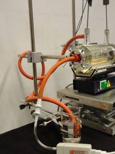 An die verbleibende obere Öffnung wird ein Silikonschlauch angeschlossen, welcher in einem mit Wasser gefülltes Becherglas endet. Es bietet sich an, das Becherglas mit einer Universalklemme zu fixieren. Dieser Schlauch dient dazu heiße Luft und entstehenden Wasserdampf aus dem Inneren des Glasmantels abzuleiten.