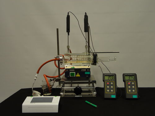 Das digitale Monometer und beide Thermometer werden eingeschaltet und die jeweiligen Werte notiert. Der H-Fuß mit der Heißplatte wird unter das Glasmantelsystem geschoben und heraufgefahren, bis ein leichter Kontakt besteht. Die Heizplatte wird eingeschaltet und mit dem Stabmagneten und dem Magnetstäbchen das Wasser so umgerührt, dass sich die Temperaturen auf beiden Thermometern nie zu stark unterscheide.