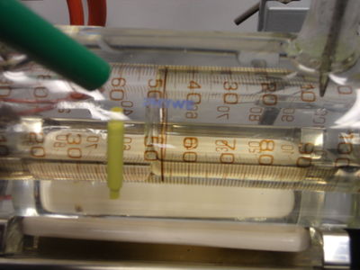 Das digitale Monometer und beide Thermometer werden eingeschaltet und die jeweiligen Werte bei einem Volumen von 50 ml notiert. Die Heißplatte auf dem H-Fuß wird unter das Glasmantelsystem geschoben und an den Zylinder angenähert, bis ein leichter Kontakt besteht. Die Heißplatte wird eingeschaltet und mit dem Stabmagneten wird das Magnetstäbchen im Inneren des Glasmantels so bewegt, dass das Wasser in Bewegung bleibt und somit gleichmäßig erwärmt wird. Wenn die Werte auf beiden Thermometern zu stark voneinander abweichen, muss stärker gerührt werden.