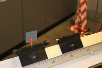 Zur Vermessung eines inelastischen Stoßes wird ein Gleiter in Ruhe zwischen den beiden Lichtschranken positioniert. Der zweite Gleiter wird von einem Ende der Luftkissenbahn in Richtung des ruhenden Gleiters in Bewegung versetzt. Die Positionen der Lichtschranken sind so zu wählen, dass nach der Messung des Startimpulses des zweiten Gleiters die Kopplung der beiden Gleiter erfolgen kann, bevor der resultierende gemeinsame Impuls durch die zweite Lichtschranke aufgenommen wird. Die Kopplung wird über einen Magneten und ein ferromagnetisches Gegenstück realisiert (siehe Abb. 4). Im Vergleich zum elastischen Stoß genügt es hier, nur den anfänglich in Bewegung versetzten Gleiter mit einer Blende zu versehen.