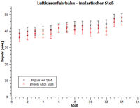 Nach der Messung ist festzuhalten, dass die Impulserhaltung innerhalb der berechneten Toleranzen eingehalten wird, allerdings ist auffällig, dass der Gesamtimpuls nach dem Stoß systematisch unter dem anfänglichen Gesamtimpuls zurückbleibt. Es ist davon auszugehen, dass Reibungsquellen nicht erkannt und behoben wurden. Der Ursprung der systematischen Unsicherheit blieb nach der Messung ungeklärt, die Unsicherheit ist aber im Rahmen der ohnehin sehr geringen Einzelimpulse akzeptabel, jedoch für die Demonstration im Unterricht hinderlich, weil die auftretende Diskrepanz den Schülerinnen und Schülern mit zusätzlichem Aufwand nahegebracht werden muss. Einen überzeugenden Nachweis der Impulserhaltung aus didaktischer Sicht liefert die durchgeführte Messung leider nicht, zu viel Erklärung wäre im Ernstfall noch von Nöten. Unter der Bedingung, dass die offensichtlichen Verluste geklärt und beseitigt werden können, aber kann die Luftkissenbahn gute Dienste im Unterricht leisten.