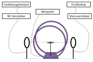 Zuerst wird an den Funktionsgenerator eine Spule angeschlossen, mit der der Magnet zum Schwingen gebracht werden kann. Wahrscheinlich ist das Signal des Generators zu schwach, weswegen noch ein Niedrigfrequenzverstärker zwischengeschaltet werden kann. Um ein Durchschmoren der Spule zu vermeiden, sollte außerdem ein Amperemeter eingebracht werden.