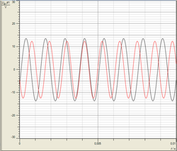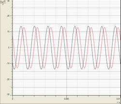 Das rechts stehende Diagramm bildet den Verlauf der Kondensatorspannung für die beiden Fälle ohne Eisenkern (schwarz) und mit Eisenkern (rot) über die Zeit ab. Die erzwungene Schwingung erkennt man daran, dass die Amplitude der Spannungskurven konstant bleibt. Wird der Eisenkern über die Spule geschoben, so verringert sich die Amplitude der Spannungskurve um ca. 1 V. Die leichte Veränderung der Spannungsamlitude hat ihre Ursache in der Erhöhung der Induktivität der Spule durch Hinzufügen eines Eisenkerns und in den damit verbundenen Wirbelstrom- und Hystereseverlusten.