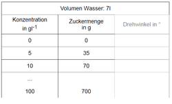 Die Experimentierleuchte wird so eingestellt, dass ein scharfes Abbild des Polarisators als Lichtfleck auf dem Schirm erkennbar ist. Erst jetzt wird der zweite Polarisationsfilter als Analysator hinter das Becken eingefügt. Nun ist die Einstellung des Analysators zu finden, in der auf dem Schirm Auslöschung eintritt. Idealerweise existieren in der Sammlung zwei solche Polarisationsfilter, in denen die Überkreuzstellung mit der Winkelanzeige übereinstimmt. Andernfalls ist die Stellung, in der Auslöschung eintritt, zu markieren und ein Winkelmaß anzubringen (vgl. Bild:polarisatoren.png). Das Volumen der Wassermenge wird bestimmt, damit die erforderlichen Zuckermengen für die gewünschten Konzentrationen berechnet und eine Wertetabelle erstellt. Eine Vorgehensweise dazu illustriert Abb. 3.