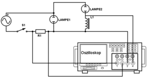 Der Aufbau wird entsprechend der Schaltpläne aufgebaut und die Quellspannung auf 7 V. Die generierte Frequenz soll zum Anfang 50 Hz betragen. Der offene Schalter wird geschlossen und im selben Augenblick beide Glühlampen beobachtet. Die Frequenz kann variiert werden von minds. 20 Hz bis 350 Hz. Vor jeder neuen Einstellung sollte erst der Schalter geöffnet werden und vor dem Schließen ein kurzer Augenblick abgewartet werden, ehe man die Schalter wieder schließt. Bei jedem Schließen des Schaltkreises sollten dann beide Glühlampen beobachtet werden sollen.