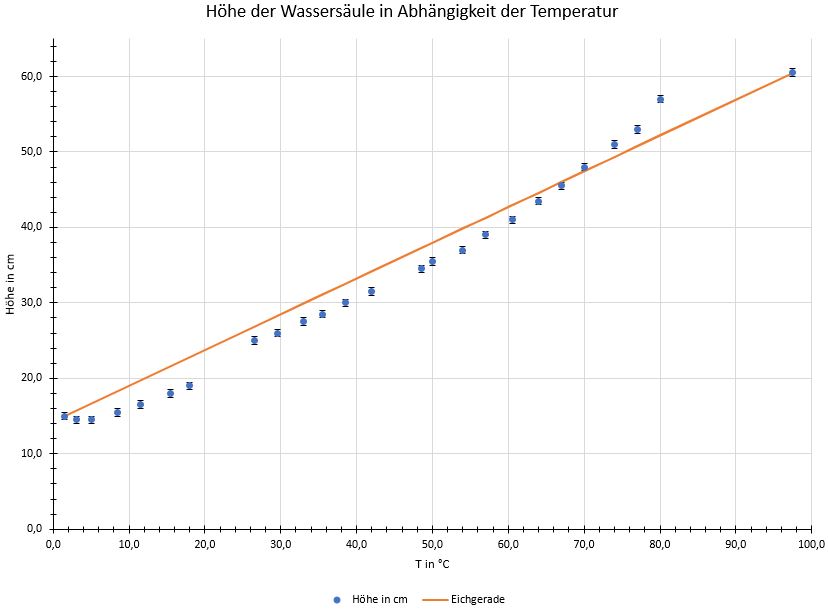 Bei einer gemessenen Raumtemperatur von 22°C hat die Säule im Thermometer eine Höhe von 23cm. Mit obiger Eichung ergibt sich eine Temperatur von 17,6°C, was mit 20% deutlich unter dem wirklichen Wert liegt. Dies ist allerdings kein Indiz für eine schlechte Messung, sondern genau das, was man durch den nicht linearen Ausdehnungskoeffizienten erwartet.