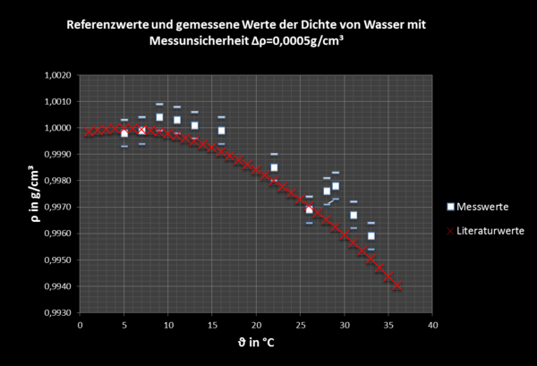 <br|> Die Messunsicherheit der Waage ist mit 0,0005g/cm³ angegeben. Beim Ablesen der Temperatur wird eine Genauigkeit von einer halben Skaleneinheit angenommen. Nach Addition des Korrekturwertes und unter Berücksichtigung der Messunsicherheit ergibt sich die folgende Wertintervall-Tabelle.