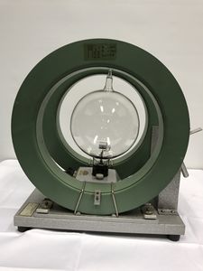 Bei diesem Aufbau ist das Fadenstrahlrohr bereits fest mit den Helmholtzspulenpaar verbunden. Es ist eine hohe Ähnlichkeit zum älteren Modell von Phylatex erkennbar.