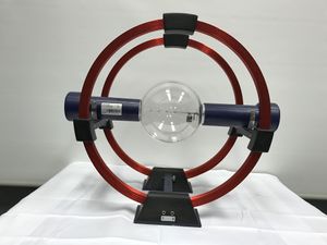 Zur allgemeinen Stabilität wird das Fadenstrahlrohr auf die Vorrichtung des Tisches aufgesetzt und befestigt. Im Anschluss können die Helmholzspulen nacheinander um das Fadenstrahlrohr am Tisch montiert werden, so dass sich das Fadenstrahlrohr im Zentrum befindet.